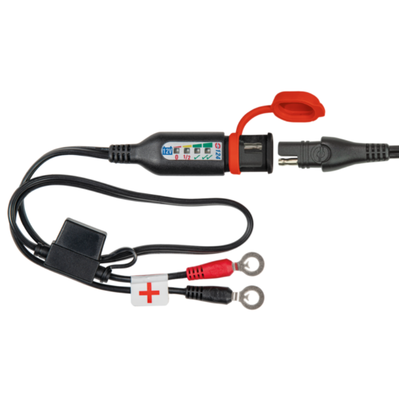 Weatherproof battery lead with state of charge monitor for the 12V lead-acid battery in your parked powersport vehicle – 24-7 battery status at a blink of an LED!